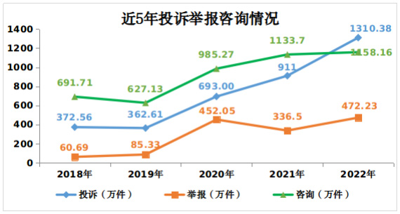 2022年,全國(guó)市場(chǎng)監(jiān)管部門(mén)通過(guò)全國(guó)12315平臺(tái)、電話、傳真、窗口等渠道共受理消費(fèi)者投訴、舉報(bào)和咨詢(xún)2940.77萬(wàn)件,同比增長(zhǎng)23.5%。其中,投訴1310.38萬(wàn)件,舉報(bào)472.23萬(wàn)件,為消費(fèi)者挽回經(jīng)濟(jì)損失45.19億元,有力保護(hù)了消費(fèi)者合法權(quán)益。主要呈現(xiàn)十大特點(diǎn):