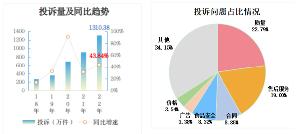 2022年,全國(guó)市場(chǎng)監(jiān)管部門(mén)受理消費(fèi)者投訴1310.38萬(wàn)件,同比增長(zhǎng)43.84%,增速較2021年有所放大。從投訴問(wèn)題看,質(zhì)量298.70萬(wàn)件、售后服務(wù)248.96萬(wàn)件、合同115.91萬(wàn)件、食品安全109.06萬(wàn)件,合計(jì)占投訴的58.96%。其中,售后服務(wù)問(wèn)題增長(zhǎng)最快,群眾反映最強(qiáng)烈,同比增長(zhǎng)57.67%。