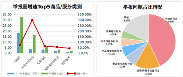 消費(fèi)者積極發(fā)揮社會(huì)監(jiān)督作用,2022年全年向市場(chǎng)監(jiān)管部門(mén)舉報(bào)各類(lèi)違法線索472.23萬(wàn)件,同比增長(zhǎng)40.34%,其中舉報(bào)廣告違法行為202.73萬(wàn)件、侵害消費(fèi)者權(quán)益行為72.31萬(wàn)件、食品安全違法行為34.18萬(wàn)件。從增幅看,不正當(dāng)競(jìng)爭(zhēng)行為、商標(biāo)違法行為、網(wǎng)絡(luò)交易違法行為舉報(bào)同比上升均超過(guò)60%。