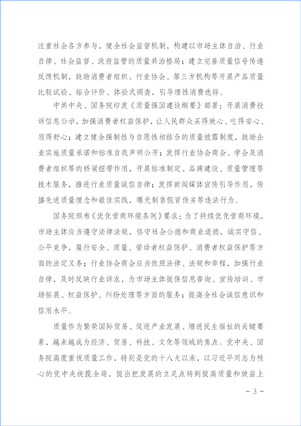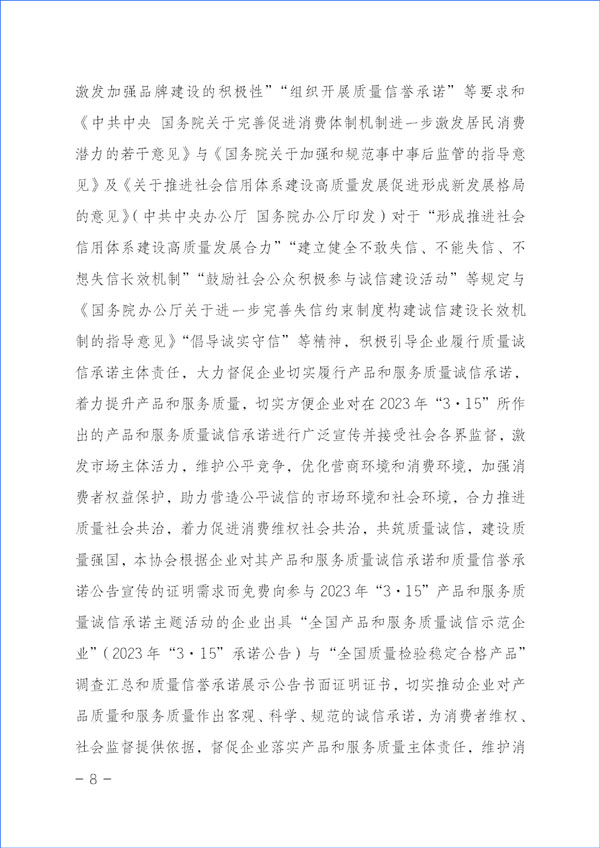 為貫徹落實(shí)《中共中央關(guān)于堅(jiān)持和完善中國特色社會(huì)主義制度 推進(jìn)國家治理體系和治理能力現(xiàn)代化若干重大問題的決定》對于“強(qiáng)化消費(fèi)者權(quán)益保護(hù)”的重要精神和《中共中央 國務(wù)院關(guān)于開展質(zhì)量提升行動(dòng)的指導(dǎo)意見》與《質(zhì)量強(qiáng)國建設(shè)綱要》對于“推廣實(shí)施優(yōu)質(zhì)服務(wù)承諾標(biāo)識(shí)和管理制度,培育知名服務(wù)品牌,全面實(shí)施企業(yè)標(biāo)準(zhǔn)自我聲明公開和監(jiān)督制度”等重要部署及《國務(wù)院關(guān)于建立完善守信聯(lián)合激勵(lì)和失信聯(lián)合懲戒制度加快推進(jìn)社會(huì)誠信建設(shè)的指導(dǎo)意見》對于“健全褒揚(yáng)和激勵(lì)誠信行為機(jī)制”“多渠道選樹誠信典型”“引導(dǎo)企業(yè)主動(dòng)發(fā)布綜合信用承諾或產(chǎn)品和服務(wù)質(zhì)量等專項(xiàng)承諾”及《建設(shè)高標(biāo)準(zhǔn)市場體系行動(dòng)方案》(中共中央辦公廳、國務(wù)院辦公廳印發(fā))關(guān)于“健全社會(huì)監(jiān)督”和《國務(wù)院辦公廳關(guān)于開展消費(fèi)品工業(yè)“三品”專項(xiàng)行動(dòng)營造良好市場環(huán)境的若干意見》有關(guān)“加強(qiáng)輿論引導(dǎo),地方各級政府和行業(yè)協(xié)會(huì)要表彰和宣傳品牌建設(shè)成就突出的企業(yè)和企業(yè)家,激發(fā)加強(qiáng)品牌建設(shè)的積極性”“組織開展質(zhì)量信譽(yù)承諾”等要求和《中共中央 國務(wù)院關(guān)于完善促進(jìn)消費(fèi)體制機(jī)制進(jìn)一步激發(fā)居民消費(fèi)潛力的若干意見》與《國務(wù)院關(guān)于加強(qiáng)和規(guī)范事中事后監(jiān)管的指導(dǎo)意見》及《關(guān)于推進(jìn)社會(huì)信用體系建設(shè)高質(zhì)量發(fā)展促進(jìn)形成新發(fā)展格局的意見》(中共中央辦公廳 國務(wù)院辦公廳印發(fā))對于“形成推進(jìn)社會(huì)信用體系建設(shè)高質(zhì)量發(fā)展合力”“建立健全不敢失信、不能失信、不想失信長效機(jī)制”“鼓勵(lì)社會(huì)公眾積極參與誠信建設(shè)活動(dòng)”等規(guī)定與《國務(wù)院辦公廳關(guān)于進(jìn)一步完善失信約束制度構(gòu)建誠信建設(shè)長效機(jī)制的指導(dǎo)意見》“倡導(dǎo)誠實(shí)守信”等精神,積極引導(dǎo)企業(yè)履行質(zhì)量誠信承諾主體責(zé)任,大力督促企業(yè)切實(shí)履行產(chǎn)品和服務(wù)質(zhì)量誠信承諾,著力提升產(chǎn)品和服務(wù)質(zhì)量,切實(shí)方便企業(yè)對在2023年“3·15”所作出的產(chǎn)品和服務(wù)質(zhì)量誠信承諾進(jìn)行廣泛宣傳并接受社會(huì)各界監(jiān)督,激發(fā)市場主體活力,維護(hù)公平競爭,優(yōu)化營商環(huán)境和消費(fèi)環(huán)境,加強(qiáng)消費(fèi)者權(quán)益保護(hù),助力營造公平誠信的市場環(huán)境和社會(huì)環(huán)境,合力推進(jìn)質(zhì)量社會(huì)共治,著力促進(jìn)消費(fèi)維權(quán)社會(huì)共治,共筑質(zhì)量誠信,建設(shè)質(zhì)量強(qiáng)國,本協(xié)會(huì)根據(jù)企業(yè)對其產(chǎn)品和服務(wù)質(zhì)量誠信承諾和質(zhì)量信譽(yù)承諾公告宣傳的證明需求而免費(fèi)向參與2023年“3·15”產(chǎn)品和服務(wù)質(zhì)量誠信承諾主題活動(dòng)的企業(yè)出具“全國產(chǎn)品和服務(wù)質(zhì)量誠信示范企業(yè)”(2023年“3·15”承諾公告)與“全國質(zhì)量檢驗(yàn)穩(wěn)定合格產(chǎn)品”調(diào)查匯總和質(zhì)量信譽(yù)承諾展示公告書面證明證書,切實(shí)推動(dòng)企業(yè)對產(chǎn)品質(zhì)量和服務(wù)質(zhì)量作出客觀、科學(xué)、規(guī)范的誠信承諾,為消費(fèi)者維權(quán)、社會(huì)監(jiān)督提供依據(jù),督促企業(yè)落實(shí)產(chǎn)品和服務(wù)質(zhì)量主體責(zé)任,維護(hù)消費(fèi)者合法權(quán)益,不斷增強(qiáng)人民群眾對質(zhì)量的獲得感、幸福感、安全感。本協(xié)會(huì)在本次活動(dòng)中向企業(yè)所出具的書面證明證書,謹(jǐn)系企業(yè)公開發(fā)布產(chǎn)品和服務(wù)質(zhì)量專項(xiàng)承諾與企業(yè)主動(dòng)公告質(zhì)量信譽(yù)情況的公告證明,不涉及評比或評價(jià)、排序。