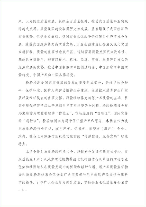 本協(xié)會(huì)作為質(zhì)量檢驗(yàn)行業(yè)協(xié)會(huì),應(yīng)該充分發(fā)揮各級質(zhì)檢中心、省級質(zhì)檢院(所)及地方質(zhì)檢機(jī)構(gòu)等技術(shù)機(jī)構(gòu)團(tuán)體會(huì)員單位的質(zhì)檢專業(yè)優(yōu)勢和社團(tuán)組織在質(zhì)量發(fā)展中的橋梁和紐帶作用,用產(chǎn)品質(zhì)量監(jiān)督抽查和質(zhì)量檢測結(jié)果為依據(jù)向廣大消費(fèi)者和用戶選購產(chǎn)品提供公正科學(xué)的指導(dǎo),引導(dǎo)廣大企業(yè)著力提升質(zhì)量,督促企業(yè)承擔(dān)質(zhì)量安全主體作用,倡導(dǎo)企業(yè)自覺履行社會(huì)責(zé)任,并切實(shí)運(yùn)用輿論宣傳作用,向全社會(huì)提供公正可靠的質(zhì)量信息和消費(fèi)信息,傳遞質(zhì)量信任,引導(dǎo)質(zhì)量消費(fèi),有效幫助消費(fèi)者選擇高標(biāo)準(zhǔn)高質(zhì)量產(chǎn)品,助力質(zhì)量供給側(cè)結(jié)構(gòu)性改革,抓好質(zhì)量提升,推進(jìn)質(zhì)量強(qiáng)國建設(shè)。