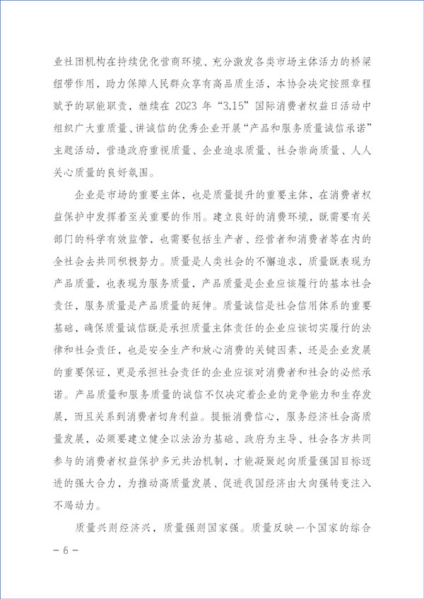 經(jīng)濟(jì)社會(huì)發(fā)展的動(dòng)力,源于市場主體的活力和社會(huì)創(chuàng)造力。本協(xié)會(huì)作為具有獨(dú)立法人資質(zhì)的社團(tuán)組織,在2023年“3·15”國際消費(fèi)者權(quán)益日“產(chǎn)品和服務(wù)質(zhì)量誠信承諾”主題活動(dòng)中,充分發(fā)揮質(zhì)量檢驗(yàn)行業(yè)組織的職能職責(zé)優(yōu)勢和社團(tuán)中介機(jī)構(gòu)的橋梁紐帶作用,嚴(yán)格遵守相關(guān)法律法規(guī)和有關(guān)規(guī)定,堅(jiān)持以“切實(shí)為企業(yè)提供自愿參與的相關(guān)服務(wù)工作,不亂收費(fèi)、不增加企業(yè)負(fù)擔(dān),不干擾公平競爭,不干擾營商環(huán)境,不干擾市場秩序,不干擾企業(yè)、企業(yè)相關(guān)負(fù)責(zé)人的正常生產(chǎn)生活,也不涉嫌評比或評價(jià)、排序,更不借活動(dòng)名義向企業(yè)攤派收費(fèi)、搭車收費(fèi)”為原則,充分發(fā)揮企業(yè)維護(hù)消費(fèi)者合法權(quán)益的市場主體作用,廣泛動(dòng)員廣大企業(yè)自愿參加本次活動(dòng),及時(shí)準(zhǔn)確地為廣大企業(yè)做好服務(wù)工作,全力為廣大企業(yè)提供力所能及的免費(fèi)增值服務(wù)而切實(shí)減輕企業(yè)負(fù)擔(dān),充分激發(fā)市場主體的活力和創(chuàng)造力,大力發(fā)揮新聞媒體的正面引導(dǎo)和輿論監(jiān)督作用,下最大氣力抓好質(zhì)量提升,大力推進(jìn)質(zhì)量社會(huì)共治,著力促進(jìn)消費(fèi)維權(quán)社會(huì)共治,引導(dǎo)動(dòng)員全社會(huì)切實(shí)維護(hù)消費(fèi)者合法權(quán)益,促進(jìn)消費(fèi)升級,改善消費(fèi)體驗(yàn),全力營造質(zhì)量誠信社會(huì)共治的氛圍,提振消費(fèi)信心,不斷滿足人民群眾對美好生活的更高要求,持續(xù)為我國經(jīng)濟(jì)構(gòu)建新發(fā)展格局和高質(zhì)量發(fā)展與質(zhì)量強(qiáng)國建設(shè)作出積極貢獻(xiàn)。