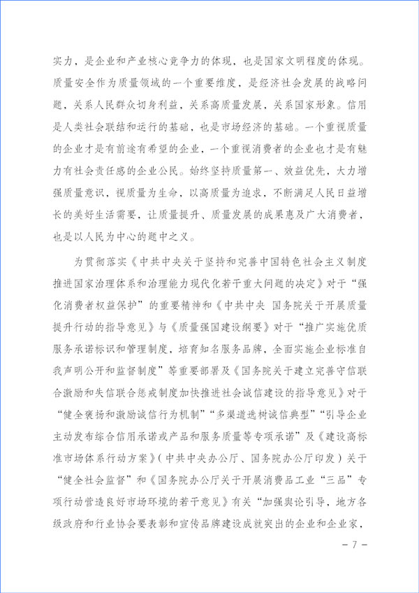 質(zhì)量興則經(jīng)濟(jì)興,質(zhì)量強(qiáng)則國家強(qiáng)。質(zhì)量反映一個(gè)國家的綜合實(shí)力,是企業(yè)和產(chǎn)業(yè)核心競爭力的體現(xiàn),也是國家文明程度的體現(xiàn)。質(zhì)量安全作為質(zhì)量領(lǐng)域的一個(gè)重要維度,是經(jīng)濟(jì)社會(huì)發(fā)展的戰(zhàn)略問題,關(guān)系人民群眾切身利益,關(guān)系高質(zhì)量發(fā)展,關(guān)系國家形象。信用是人類社會(huì)聯(lián)結(jié)和運(yùn)行的基礎(chǔ),也是市場經(jīng)濟(jì)的基礎(chǔ)。一個(gè)重視質(zhì)量的企業(yè)才是有前途有希望的企業(yè),一個(gè)重視消費(fèi)者的企業(yè)也才是有魅力有社會(huì)責(zé)任感的企業(yè)公民。始終堅(jiān)持質(zhì)量第一、效益優(yōu)先,大力增強(qiáng)質(zhì)量意識(shí),視質(zhì)量為生命,以高質(zhì)量為追求,不斷滿足人民日益增長的美好生活需要,讓質(zhì)量提升、質(zhì)量發(fā)展的成果惠及廣大消費(fèi)者,也是以人民為中心的題中之義。