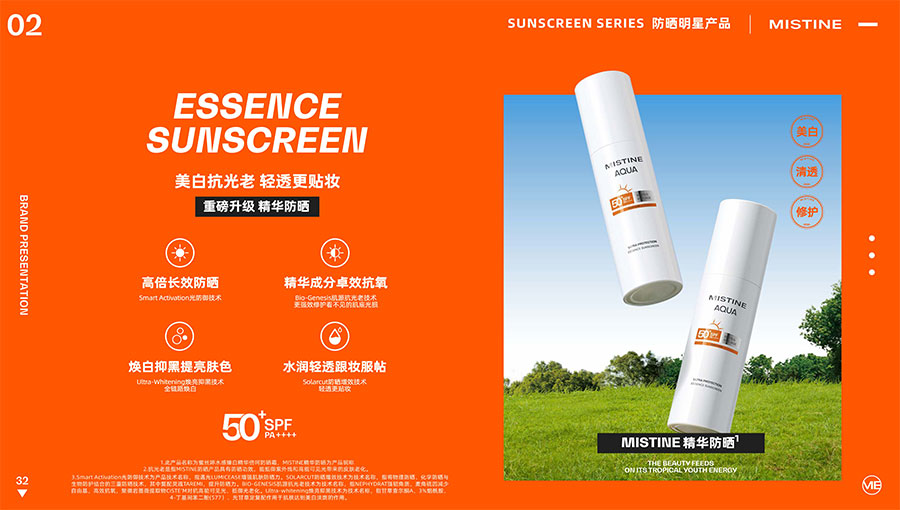 MISTINE蜜絲婷提出皮膚科學、前沿科技、靈魂成分、熱帶美學、卓越功效、保護環(huán)境六大品牌價值,致力于為全球女性提供豐富、安全、高品質(zhì)的美妝產(chǎn)品?;贛ISTINE蜜絲婷品牌首席科學顧問——全球計算生物學權威之一、諾貝爾化學獎得主Arieh Warshel的研究,MISTINE蜜絲婷創(chuàng)新防曬品類推出「光生物學」防曬系統(tǒng),提出“外層防護、中層修護和底層抗損”防曬新理念,引領防曬從“表面防護”進入“深度抗光老”新時代。同時,MISTINE蜜絲婷還持續(xù)深耕專業(yè)彩妝市場,以熱帶美學基因造就產(chǎn)品防水防汗、高倍耐曬、長效持妝的優(yōu)勢,圍繞消費者需求打造多元化的產(chǎn)品矩陣,引領防曬、底妝賽道發(fā)展。