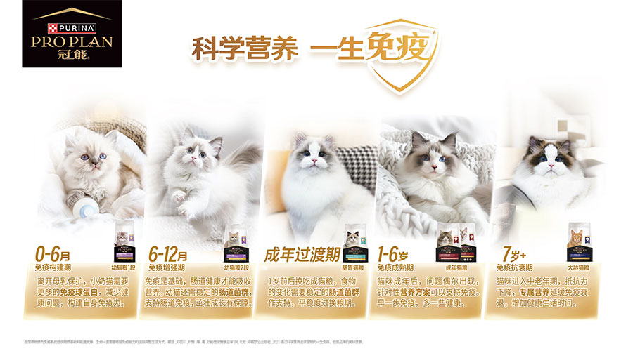 *指營養(yǎng)物質(zhì)為免疫系統(tǒng)提供物質(zhì)基礎(chǔ)和能量支持,生命一直需要根據(jù)免疫能力的強弱調(diào)整生活方式。蔡旋,鄧百川, 劉策等著. 功能性寵物食品學(xué)[M]. 北京:中國農(nóng)業(yè)出版社,2023.通過科學(xué)營養(yǎng)追求寵物的一生免疫,也是品牌的美好愿景。