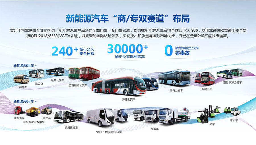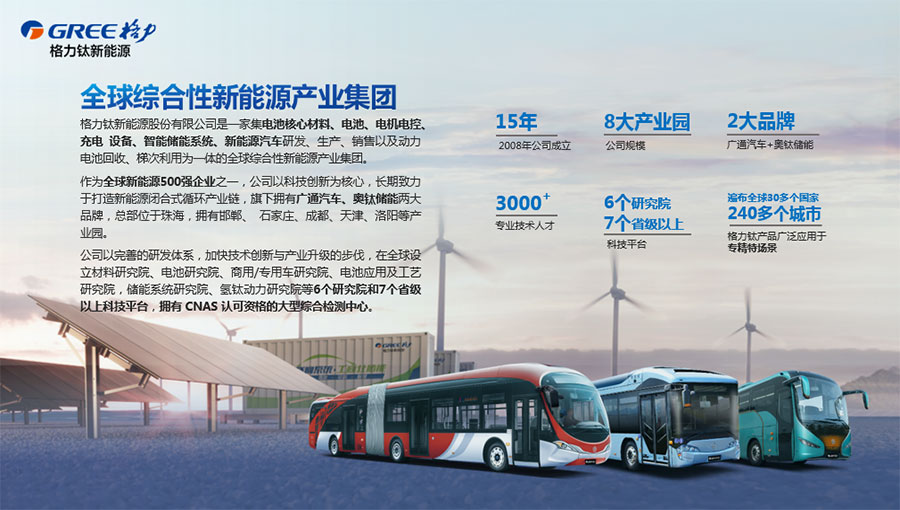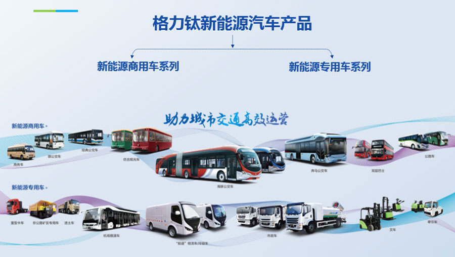 格力鈦新能源股份有限公司一直致力于研發(fā)混合動(dòng)力、氫燃料、純電動(dòng)車(chē)等一系列節(jié)能減排的新能源環(huán)保型客車(chē)/公交車(chē)/物流車(chē),所研制產(chǎn)品體現(xiàn)了電子化、智能化、綠色化、節(jié)能化的鮮明特色,堅(jiān)持以產(chǎn)品開(kāi)發(fā)和市場(chǎng)開(kāi)拓相結(jié)合的經(jīng)營(yíng)方針,引進(jìn)國(guó)外先進(jìn)客車(chē)生產(chǎn)技術(shù),力爭(zhēng)通過(guò)資本、技術(shù)及產(chǎn)業(yè)優(yōu)勢(shì),做大區(qū)域市場(chǎng),進(jìn)軍國(guó)際市場(chǎng),力爭(zhēng)成為中國(guó)新能源汽車(chē)的領(lǐng)軍企業(yè)集團(tuán)。