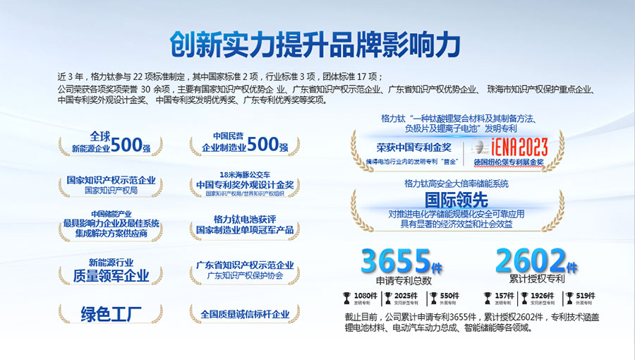 2022年,“一種鈦酸鋰復(fù)合材料及其制備方法、負(fù)極片及鋰離子電池”發(fā)明專(zhuān)利獲得中國(guó)專(zhuān)利金獎(jiǎng),摘得鋰電池行業(yè)內(nèi)的發(fā)明專(zhuān)利“首金”;2023年,該專(zhuān)利技術(shù)再次斬獲第75屆德國(guó)紐倫堡發(fā)明國(guó)際金獎(jiǎng)。“高安全大倍率儲(chǔ)能系統(tǒng)關(guān)鍵技術(shù)研發(fā)與應(yīng)用”項(xiàng)目被中國(guó)機(jī)械工業(yè)聯(lián)合會(huì)鑒定達(dá)到“國(guó)際領(lǐng)先”水平。截止目前,公司先后獲得“中國(guó)民營(yíng)企業(yè)制造業(yè)500強(qiáng)”、“全國(guó)質(zhì)量信得過(guò)產(chǎn)品”、“客車(chē)安全技術(shù)成果獎(jiǎng)”、“中國(guó)儲(chǔ)能產(chǎn)業(yè)最具影響力企業(yè)獎(jiǎng)、最佳系統(tǒng)集成商、最佳儲(chǔ)能電池供應(yīng)商”等榮譽(yù),獲得工信部頒發(fā)的“綠色工廠”榮譽(yù)稱(chēng)號(hào);上榜科技部發(fā)布的新能源領(lǐng)域獨(dú)角獸企業(yè),多年入選全球新能源企業(yè)500強(qiáng),入選“全國(guó)百佳質(zhì)量檢驗(yàn)誠(chéng)信標(biāo)桿企業(yè)”、“國(guó)家知識(shí)產(chǎn)權(quán)優(yōu)勢(shì)企業(yè)”等。