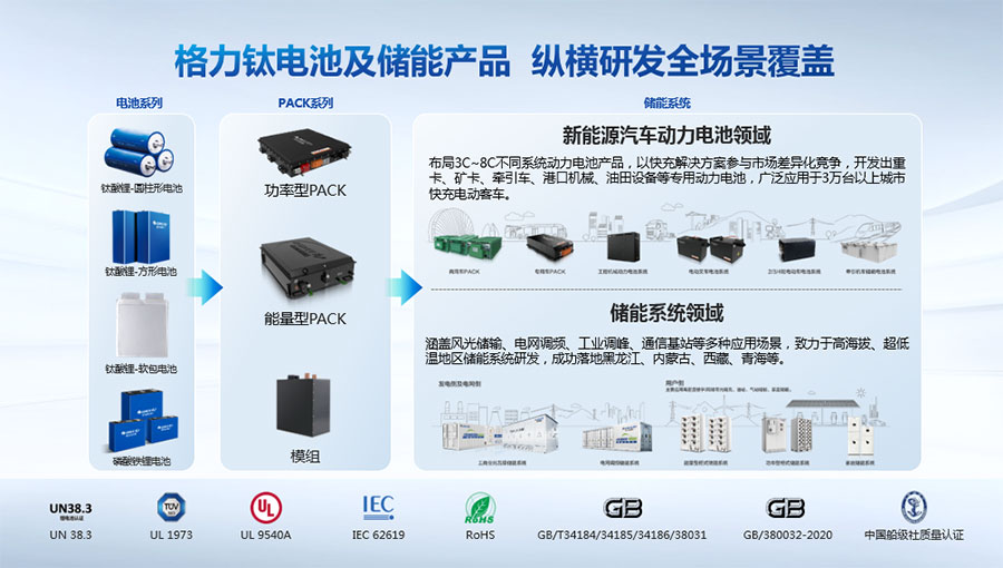 鈦酸鋰電池技術(shù)是新能源行業(yè)唯一獲得中國(guó)專(zhuān)利獎(jiǎng)金獎(jiǎng)的鋰電池產(chǎn)品技術(shù),其應(yīng)用于儲(chǔ)能電池和動(dòng)力電池具有超高安全性,在快充放、耐寬溫、長(zhǎng)壽命等方面同樣具有卓越的性能。格力鈦電池系列產(chǎn)品具有不起火不爆炸高安全、6分鐘快充放、-50℃至60℃耐寬溫特性,循環(huán)充放電次數(shù)高達(dá)30000多次,使用壽命長(zhǎng)達(dá)30年。格力鈦電池經(jīng)利鋸切割、尖針穿刺、強(qiáng)力擠壓、電鉆沖孔、短路充放電、高溫加熱、槍擊等極限條件測(cè)試,均未發(fā)生冒煙、起火、燃燒、爆炸等現(xiàn)象。