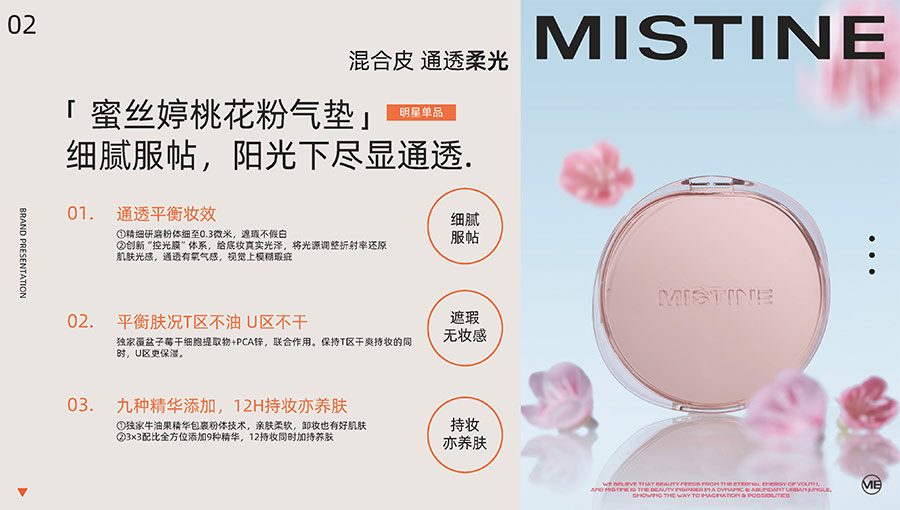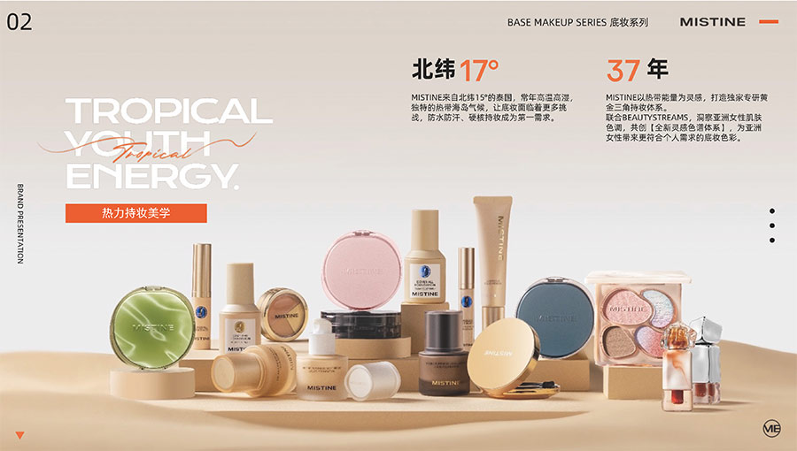 MISTINE蜜絲婷1988年始源于泰國,作為知名國際美妝品牌,擁有37年科研底蘊,產(chǎn)品種類涵蓋防曬、美妝、護膚、香水、個護五大類,擁有近6000多個單品暢銷全球20多個國家,專注為全球女性提供豐富、安全、高品質(zhì)的美妝產(chǎn)品。自2016年進入中國后,MISTINE蜜絲婷以“熱帶青春能量美妝”為品牌定位,為年輕人打造更懂得他們的全新美妝產(chǎn)品,并傳遞獨特的健康活力生活方式。
