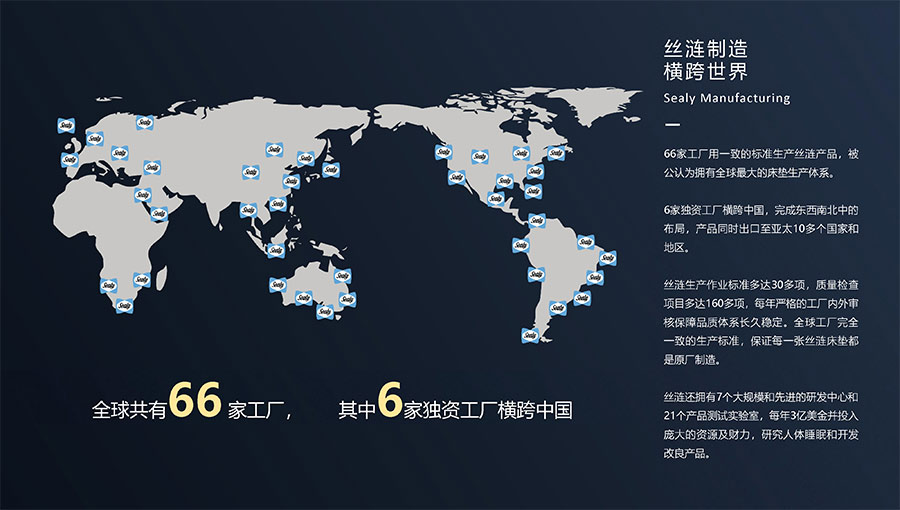 66家工廠用一致的標(biāo)準生產(chǎn)絲漣產(chǎn)品,被公認為擁有全球最大的床墊生產(chǎn)體系。