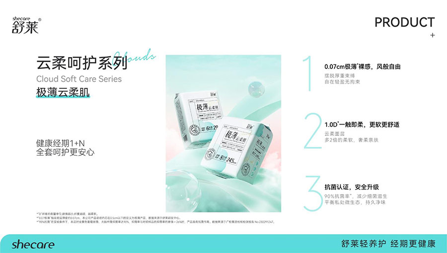 河南舒萊衛(wèi)生用品有限公司旗下?lián)碛惺嫒R、凸凸棉、純也、優(yōu)月季等品牌,產(chǎn)品涵蓋衛(wèi)生巾、安睡褲、護(hù)理液等品類。其中,舒萊品牌:S.H.E.CARE經(jīng)期健康管理體系,從科學(xué)、健康、舒適三大維度全方位呵護(hù)女性經(jīng)期健康。舒萊“輕養(yǎng)護(hù)”以漢方調(diào)養(yǎng)為根基,以科學(xué)抑護(hù)為本色,全方位調(diào)節(jié)女性經(jīng)期健康指數(shù),輕松實(shí)現(xiàn)經(jīng)期護(hù)理;凸凸棉品牌:獨(dú)創(chuàng)A.C.E.CARE品質(zhì)管理體系,以Air Tech干爽透氣、Comfort Tech舒適體感、Ecology Tech安全衛(wèi)生為核心,打造更懂女性的護(hù)理體驗(yàn)。